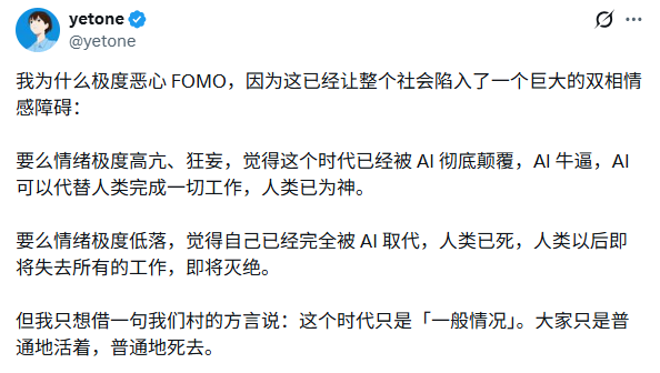 As AI developer @yetone bluntly stated on social media: "I am extremely disgusted by FOMO, which has already plunged the entire society into a massive bipolar disorder: either extremely euphoric, believing humans have become gods; or extremely depressed, feeling that humanity is dead."