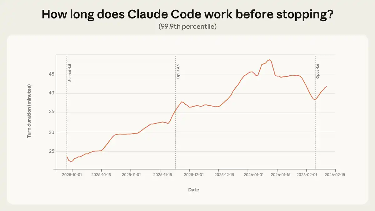 D'octobre 2025 à janvier 2026, la durée de session unique au 99,9e centile a presque doublé, passant de moins de 25 minutes à plus de 45 minutes. La croissance a été régulière entre les versions du modèle. Ce n'est pas seulement que le modèle devient plus fort, c'est que les utilisateurs apprennent au fil des utilisations, étendant progressivement leur confiance envers l'Agent.