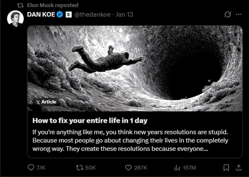 Currently, the most impactful article is from DAN KOE titled "How to Fix Your Life in 1 Day." This article has already garnered over 150 million reads and received a retweet from Musk.