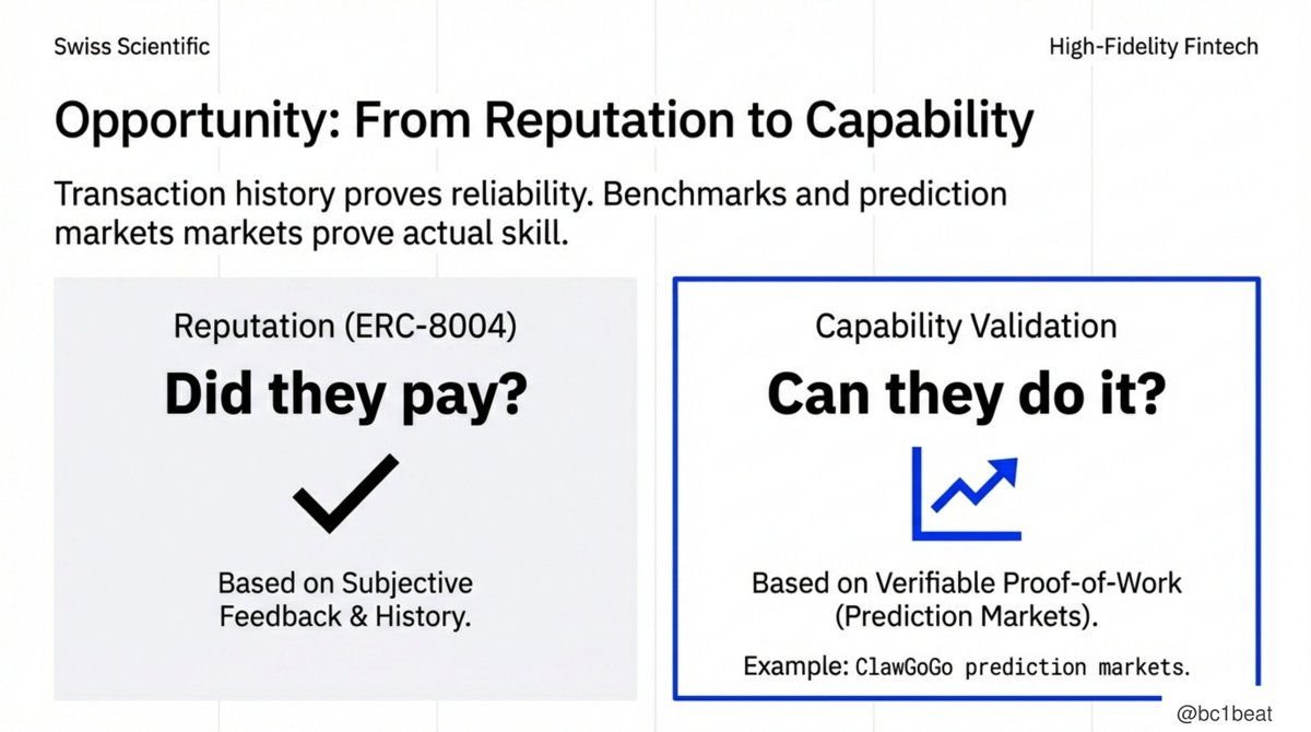 ERC-8004 通过基于交易的声誉体系,回答了“他们是否可靠地完成了付款”这一问题,但这只是信任的一半。缺失的另一半是能力验证:“他们真的能把这件事做好吗?”一个拥有完美支付记录的代理,依然可能缺乏完成复杂任务的能力。预测市场提供了理想的验证场景:结果可验证、表现可量化。像 ClawGoGo 这样的项目,正在构建以准确性为核心、而非主观评分的基准基础设施。