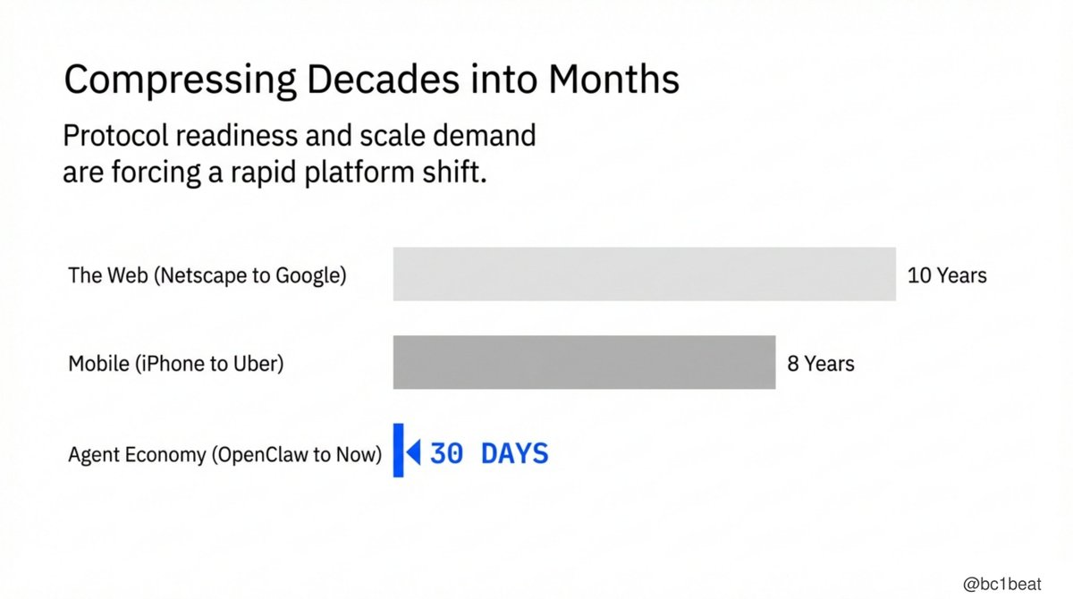 历史上的平台迁移周期往往以十年计:Web 从 Netscape 到 Google 用了 10 年,移动互联网从 iPhone 到应用全面普及用了 8 年。而代理经济在 30 天内完成了支付、信任、社交和开发框架的完整基础设施拼装。协议成熟度与规模化需求正在把数十年的平台演进压缩成数月,需求侧构建者的窗口期已经打开。