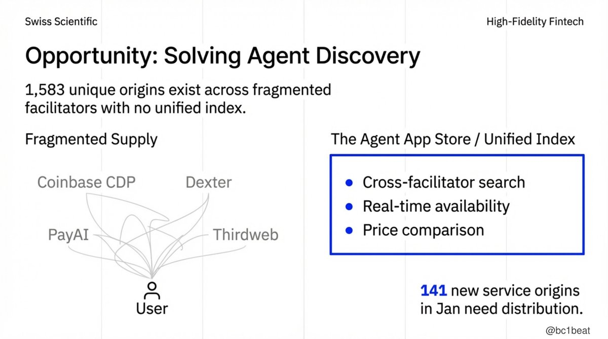 目前代理要寻找服务,必须分别查询 Coinbase CDP、Dexter、PayAI Network 和 thirdweb,每个平台都有不同的 API 和返回格式。仅在 1 月,就有 141 个新服务上线,却缺乏有效的分发渠道。真正的机会在于构建一个统一索引层:跨平台搜索、实时可用性、价格对比——一个“代理版 App Store”。谁能构建出决定性的发现体验,谁就会成为代理商业的入口。