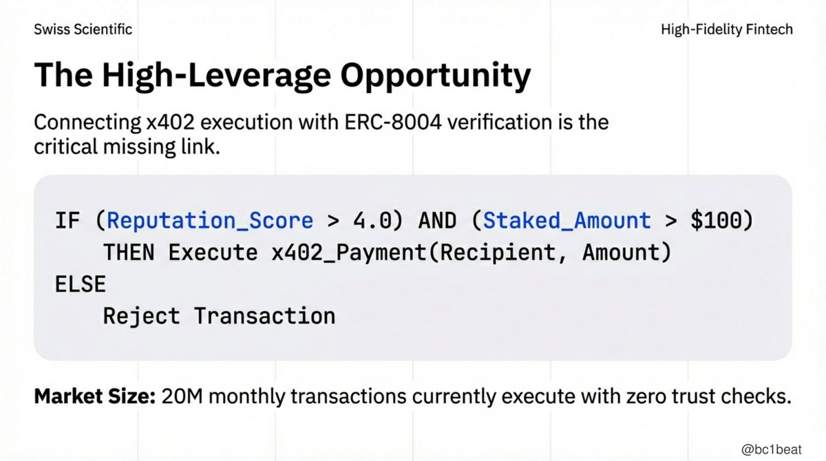 当前每月约 2000 万笔交易在执行时,没有任何信任校验。这为“信任门控支付中间件”创造了极高杠杆的机会。其集成逻辑非常直接:在授权 x402 支付前,查询 ERC-8004 的声誉数据,设定可配置的阈值,并在结算后提交反馈。例如:如果 Reputation_Score > 4.0 且 Staked_Amount > 100 美元,则执行支付;否则拒绝。目前还没有任何团队构建出这样的生产级 SDK。第一个落地的团队,将占据这两个协议之间的关键集成层。