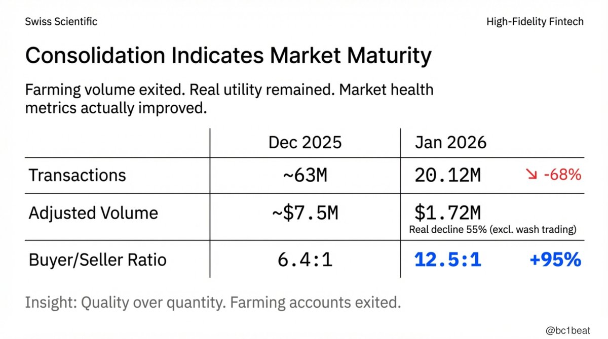 从表面数据来看,情况并不乐观:交易笔数下降 68%,交易量下降 77%。但真正重要的是背后的整合过程。Artemis 的分析显示,12 月份约 47% 的交易量来自非自然的“刷量行为”,剔除这部分后,实际下降幅度更接近 55%。与此同时,买卖双方比例几乎翻倍,从 6.4:1 提升至 12.5:1。刷量账户退出,真实需求留下,每一个存活下来的服务提供者正在服务更多真实用户,这是一次典型的“质量替代数量”。