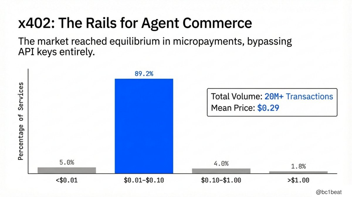 x402 已经找到了自己的定价均衡。当前 89.2% 的服务将价格设定在 0.01–0.10 美元之间,这是一个稳定币结算成本远低于信用卡通道费的“甜蜜区间”。随着市场逐渐收敛至微支付经济模型,x402 的平均价格在一个月内从 0.81 美元下降至 0.29 美元。2000 万笔以上的交易量、无需 API Key、原生支持 HTTP,这意味着代理商业所需的支付轨道已经真正跑通,并且定价合理。