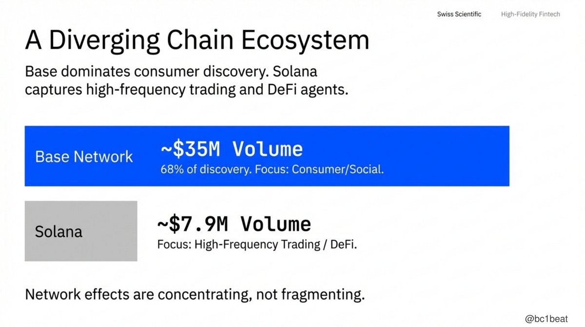 多链格局正在收敛而非分散。Base 链在 1 月份占据约 3500 万美元交易量和 68% 的服务注册份额,受益于 Coinbase CDP 的深度集成以及 Molttask 市场;Solana 约占 790 万美元,主要集中在高频交易和 DeFi 代理场景。网络效应正在集中,构建者应当以 Base 为优先,同时针对交易型应用适配 Solana。