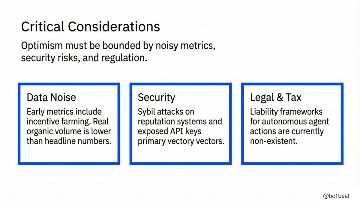 乐观情绪需要保持克制,有三个关键风险需要正视。其一是数据噪音,早期指标中仍包含激励刷量,真实有机交易规模低于头部数据;其二是安全问题,针对声誉系统的女巫攻击以及 API Key 泄露仍是主要攻击向量,Moltbook 已经出现相关事件;其三是法律与税务,针对自主代理行为的责任归属框架尚不存在。构建者应当以对抗性环境为前提设计系统,而非假设理想状态。