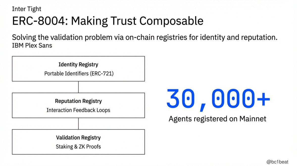 ERC-8004 的核心价值在于让信任成为可组合的模块。它由三个链上注册表共同构成:基于 ERC-721 的身份注册表,为代理提供可携带、抗审查的身份标识;记录每次交互反馈的声誉注册表;以及支持多种信任模型的验证注册表,从简单的质押机制到零知识证明都可以接入。目前已有超过 3 万个代理在主网上完成注册,信任基础设施已经存在,真正的问题在于它能以多快的速度被采用。