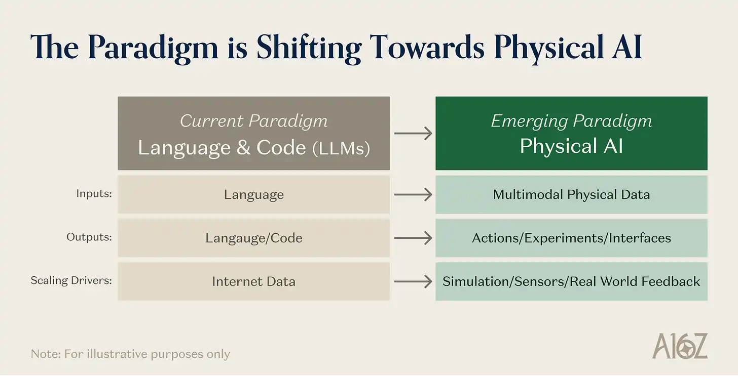 Deep Tide Introduction: This article is from a16z researcher Oliver Hsu and is the most systematic "Physical AI" investment map since 2026. His judgment is: the language/code mainline is still scaling, but the areas that can truly develop the next generation of disruptive capabilities are the three fields adjacent to the mainline—general-purpose robots, autonomous science (AI scientists), and new human-computer interfaces like brain-computer interfaces. The author breaks down the five underlying capabilities that support them and argues that these three fronts will form a structurally reinforcing flywheel that feeds into each other. For those who want to understand the investment logic of Physical AI, this is currently the most complete framework.