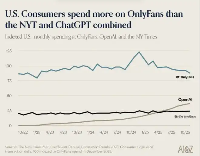 A16Z, a top-tier VC in Silicon Valley's investment circle, released a report on AI consumer trends. This report, which should have seriously discussed AI productivity, contained a laughable line graph: last year, American users spent more money on OnlyFans than on OpenAI and The New York Times combined.