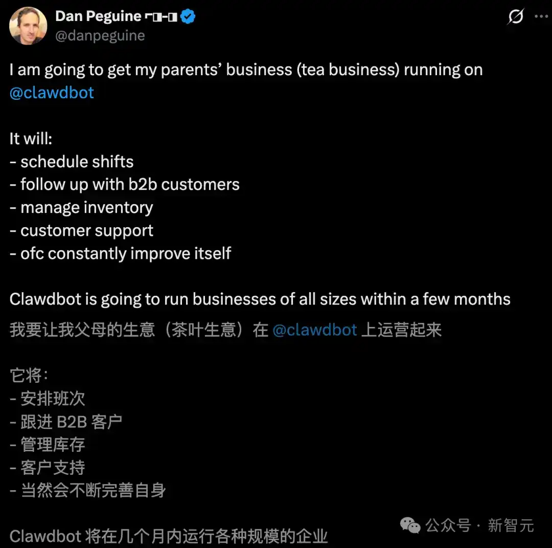 He exclaimed in amazement, "In a few months, Clawdbot will probably be able to manage businesses of any scale."