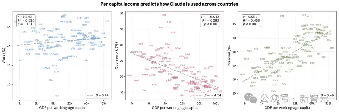But in countries with lower per capita GDP, Claude's primary role is "teacher," with大量 (a large number of) uses concentrated on coursework and educational tutoring.