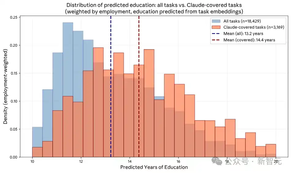 Data indicates that the tasks currently covered by Claude require, on average, 14.4 years of educational background (equivalent to an associate degree), significantly higher than the 13.2 years required on average for overall economic activity.
