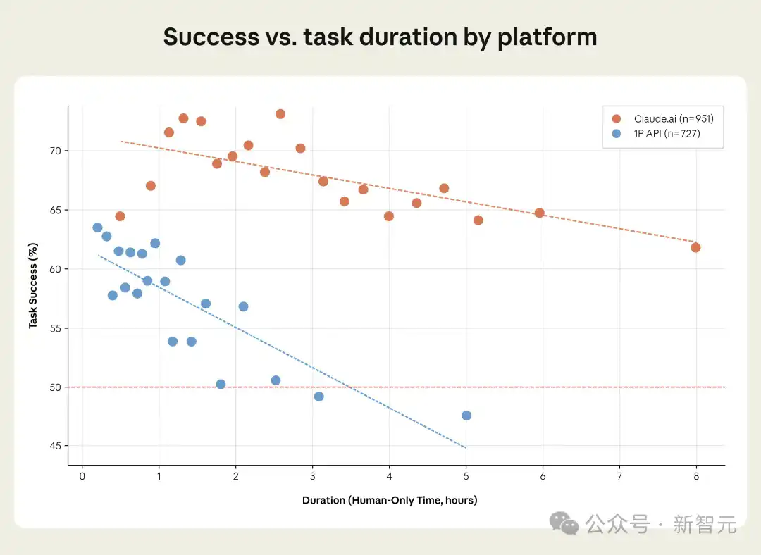 This human-AI collaborative workflow pushes the (50% success rate measured) task duration上限 (upper limit) from 2 hours to about 19 hours, nearly a 10-fold increase.