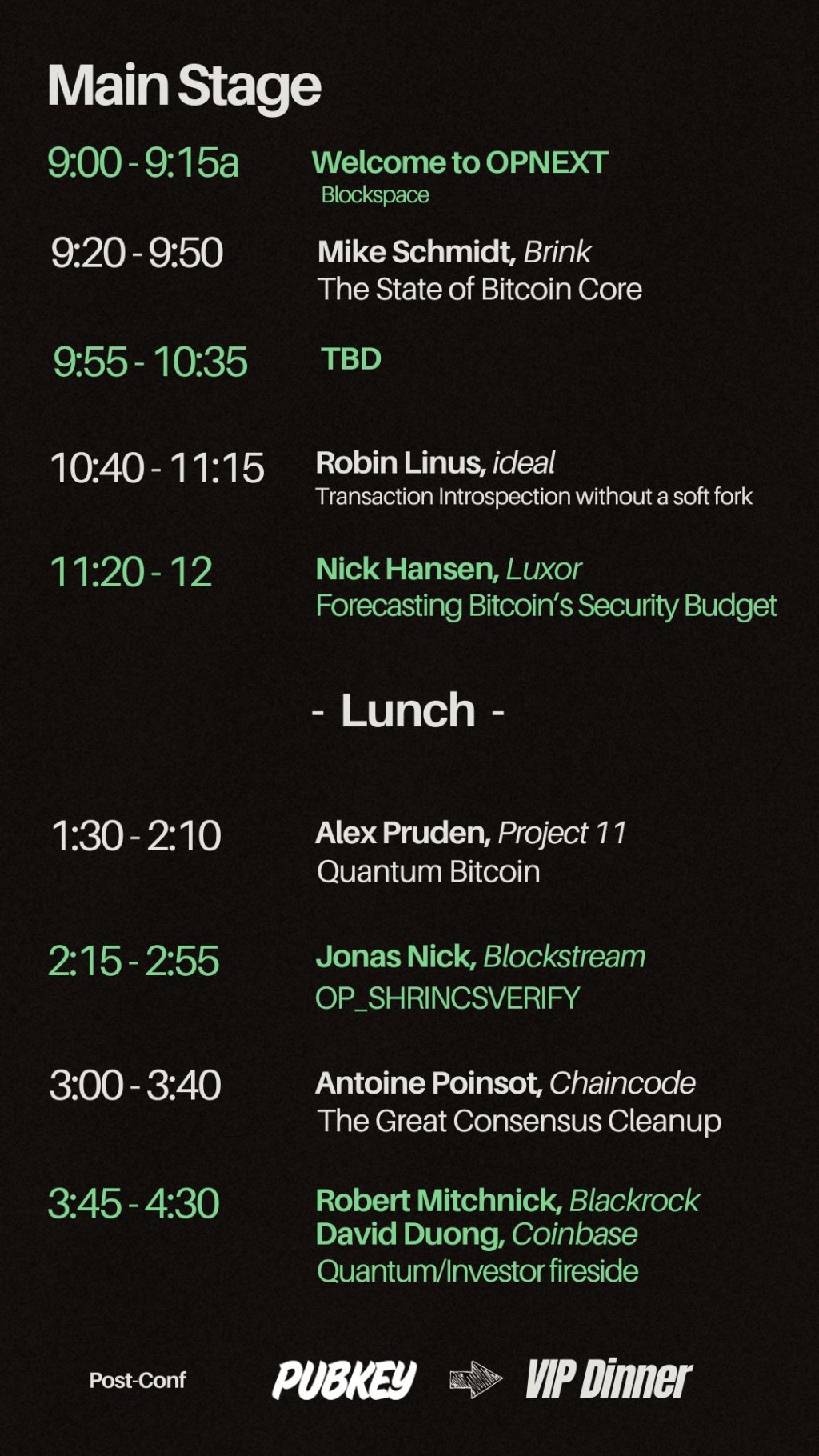 The event lineup itself also reinforces Corallo’s point. Quantum is not a one-off mention tied only to Jonas Nick’s OP_SHRINCSVERIFY session. The main stage schedule also includes Alex Pruden of Project 11 speaking on “Quantum Bitcoin,” and later a “Quantum/Investor fireside” featuring Robert Mitchnick of BlackRock and David Duong of Coinbase.