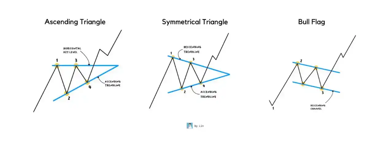 When a stock's price rises and then stalls, these base patterns are called continuation patterns. The most common continuation patterns are flags and triangles.