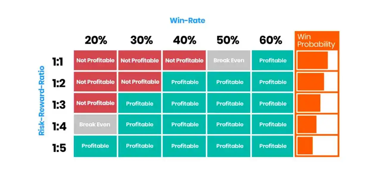 It shows the relationship between win rate and risk-reward ratio. Suppose your win rate is only 30%. In this case, your profits must be more than twice your losses to break even. To actually make money, your profits should be about three times your losses. This is when your strategy starts to work.