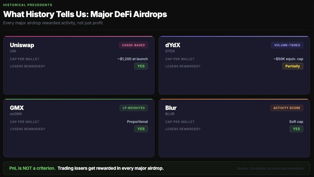 - In all major airdrops, losers are also rewarded — PnL is not a criterion.