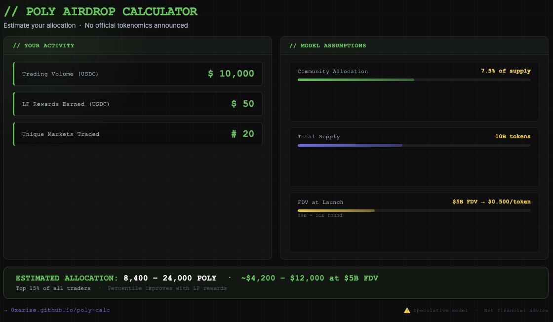 Without a cap on airdrop amount per address, for a volume of $85 million (taking top trader fredi999 as an example), the model estimates about 3–5 million POLY. At a $90 billion FDV, this is equivalent to $3–4.5 million. Theoretically possible, but the PR effect would be terrible.