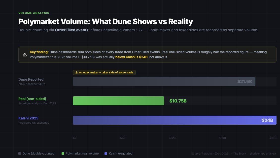 Paradigm published a key finding in a study in December 2025: Most Polymarket data dashboards count trading volume by summing all "OrderFilled" events, but this event is triggered on both the maker and taker sides of the same transaction, resulting in double counting. The actual trading volume is only about half of the number presented on the dashboards.