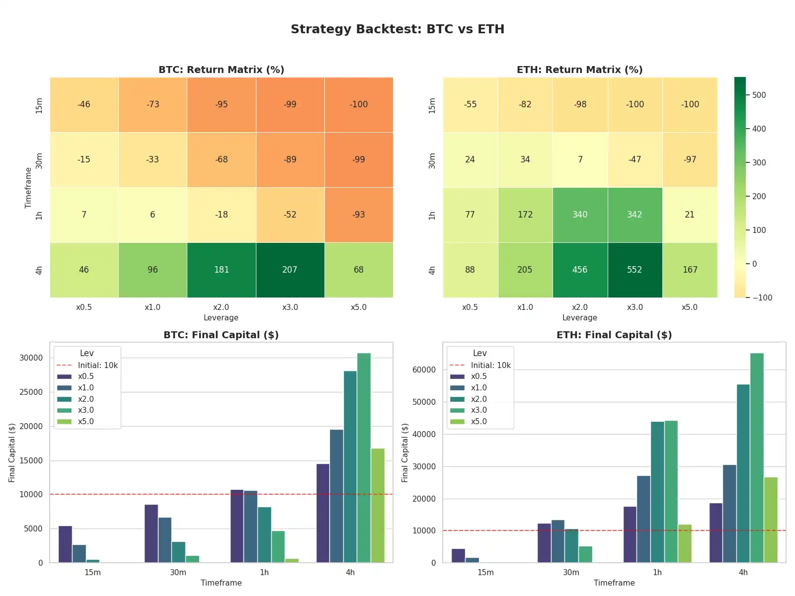 | ETH | 4h | x5.0 | ✅ | +167% | Mediocre. Risk increases dramatically, returns反而 decrease (funding fees + erosion). |