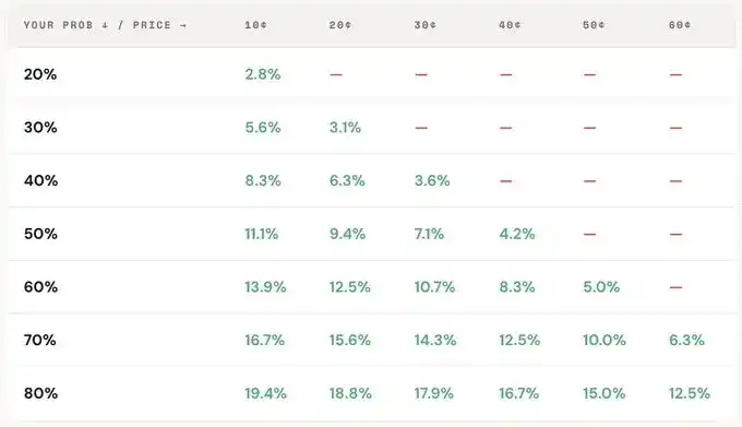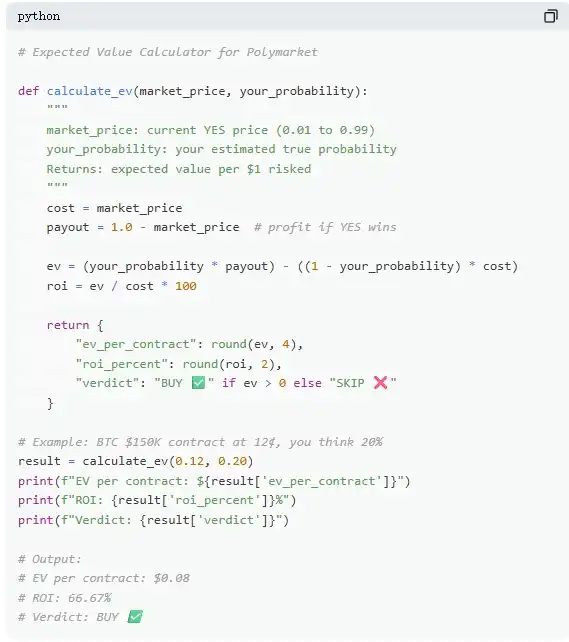 Take a real market as an example: "Will Bitcoin reach $150,000 before June 2026?" The current YES price is 12¢, corresponding to a market-implied probability of 12%. If, based on on-chain data, halving cycles, and ETF flows, you judge the true probability to be around 20%, then this trade has positive expected value. According to this calculation, for every contract bought at 12¢, the long-term average gain is 8¢; buying 100 contracts, at a cost of $12, yields an expected profit of $8, a return of approximately +66.7%.