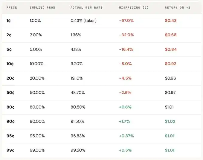 "Long-shot bias" is one of the most expensive mistakes in prediction markets. Traders often systematically overestimate low-probability events, paying too high a price for seemingly cheap contracts. A contract priced at 5¢ should have a 5% win rate theoretically, but on Kalshi the actual win rate is only 4.18%, corresponding to a -16.36% pricing偏差 (bias); in more extreme cases, a 1¢ contract should have a 1% win rate, but for takers, the actual win rate is only 0.43%, a偏差 of -57%.