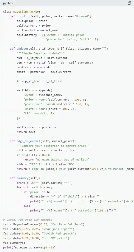Take a typical market: "Will the Fed cut rates at the June meeting?" The current market price is 35¢, corresponding to a 35% probability, serving as the initial belief (prior). Then the non-farm payroll data is released, showing only 120K new jobs (expected 200K), with rising unemployment and slowing wage growth. In this scenario, if the Fed were indeed going to cut rates, the probability of seeing weak employment data is high, estimated at 70%; if it were not going to cut rates, the probability of such data appearing is lower but still possible, estimated at 25%.