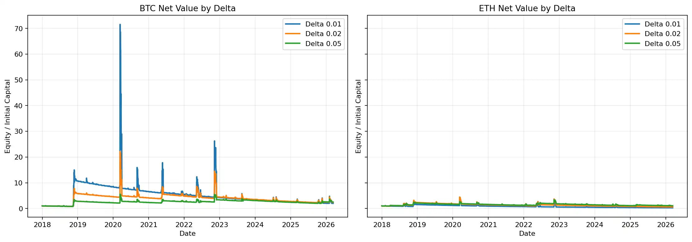 Looking at the average results across the full parameter grid, BTC clearly outperforms ETH. The average total return for all parameter combinations for BTC was 1326.06%, with an average CAGR of 23.87% and an average Tail Insurance Score of 0.544; for ETH, these figures were 519.48%, 13.39%, and 0.362, respectively. In the baseline portfolio, BTC was positive and ETH was negative. This difference is also very evident in the net value comparison charts across different Deltas and durations.