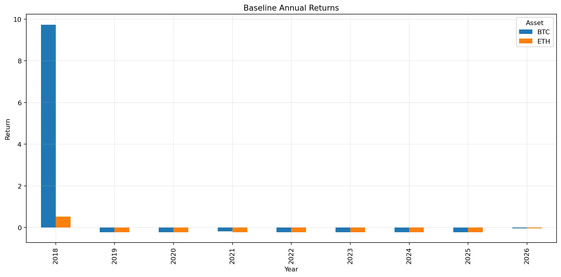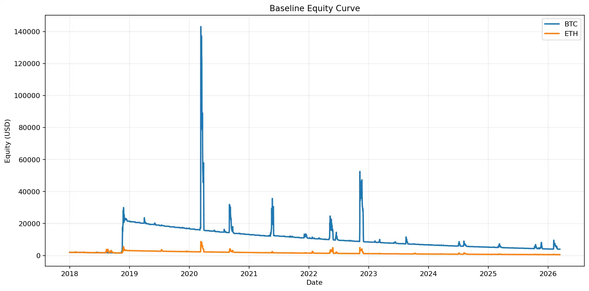 Figure 1: The equity curve of the baseline portfolio shows a clear divergence in long-term results between BTC and ETH. BTC ultimately achieved a positive return, while ETH's net value declined over the long term.