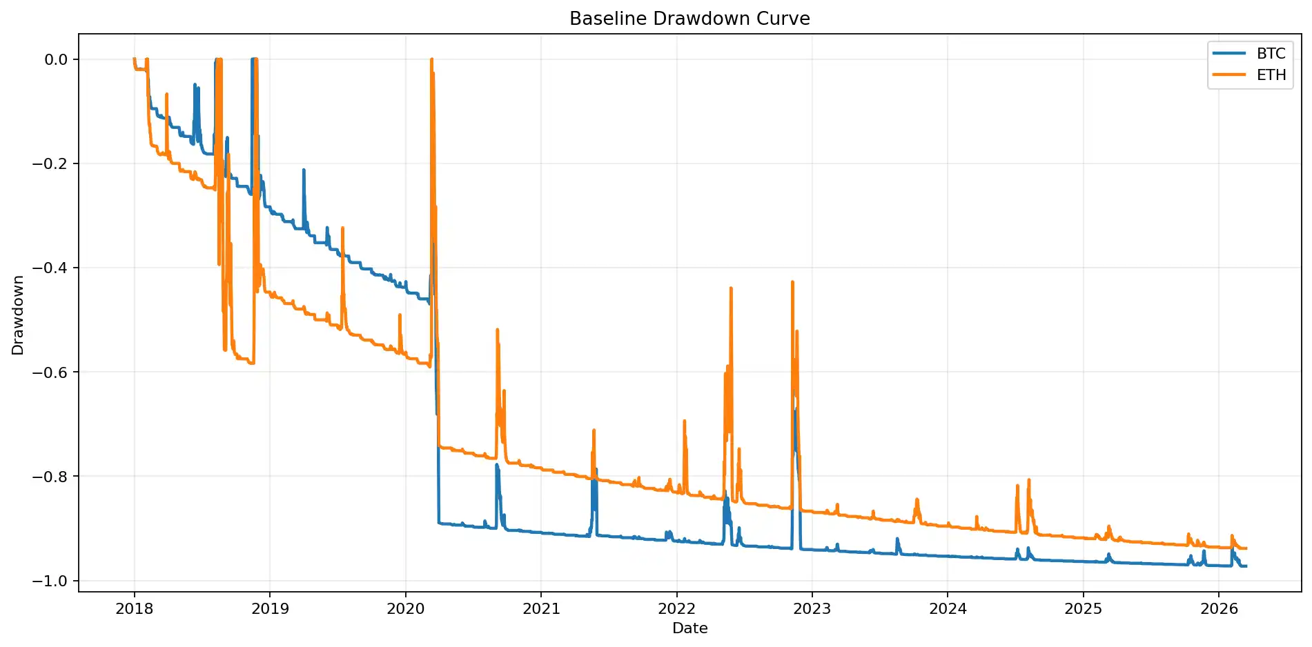 Figure 2: The drawdown curve illustrates that even if such strategies ultimately make money, they can remain deeply underwater for long periods. The maximum drawdown for the BTC baseline portfolio reached -97.24%, and for ETH it was -93.82%.