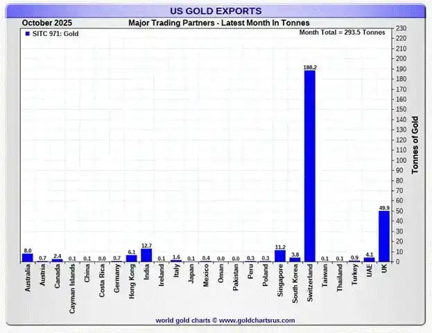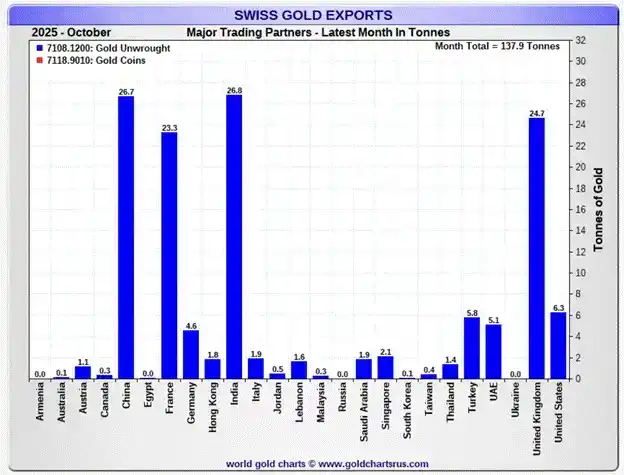 The flow path of gold is: the US exports gold to Switzerland, where it is refined and recast, then shipped to other countries. The chart below shows that it is mainly China, India, and other emerging economies that manufacture physical goods or export commodities that buy this gold. The physical goods ultimately flow to the US, while the gold flows to the more productive regions of the world.