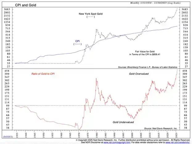 In the fiat system, the traditional view of gold is as an inflation hedge. Therefore, it should roughly track the empire-manipulated CPI index. The chart above shows that since the 1930s, gold has roughly tracked this index. However, starting in 2008 and accelerating after 2022, the price of gold has risen far faster than inflation. So, is gold in a bubble, ready to harvest gamblers like me?