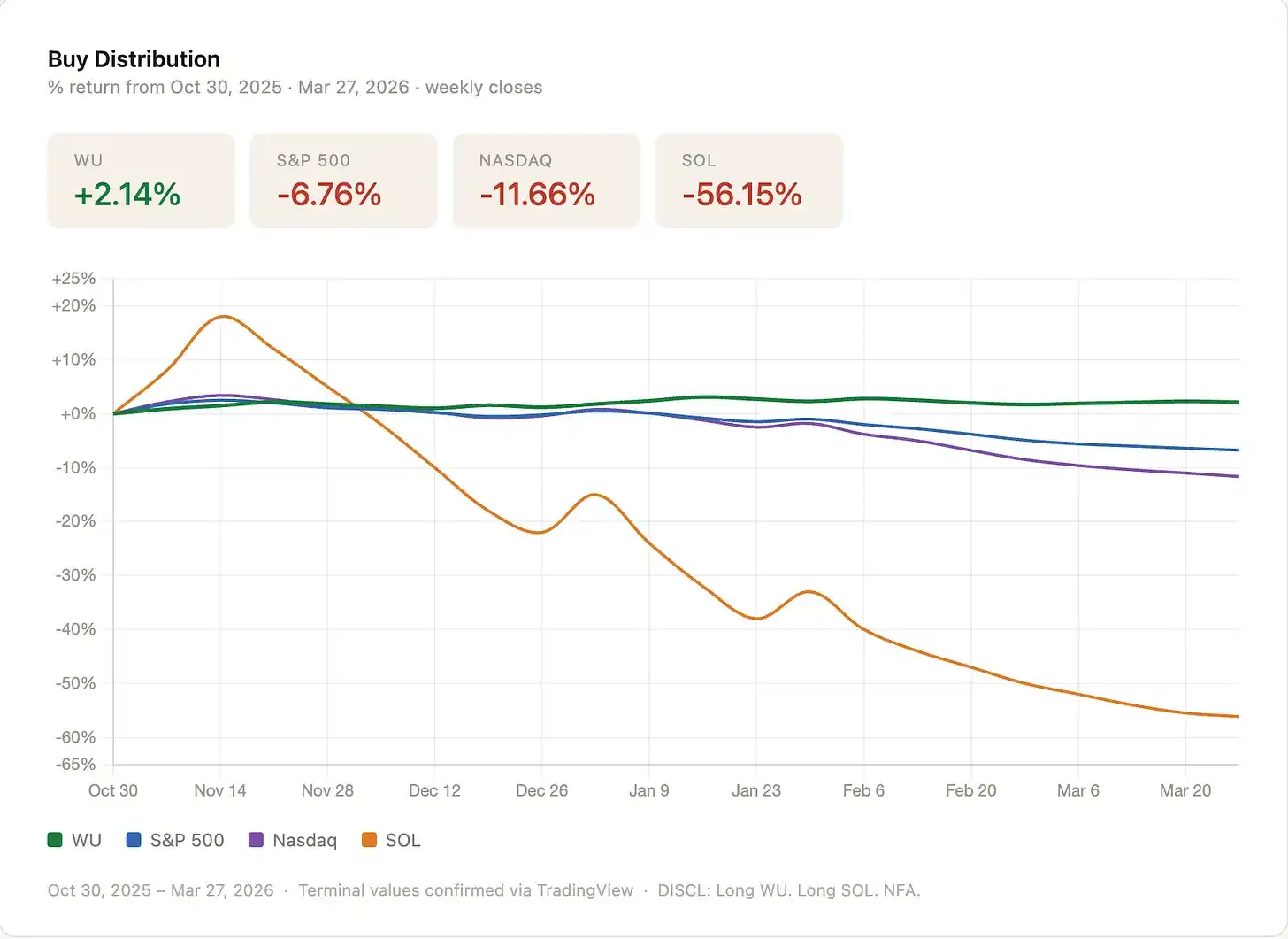 The author bet in November 2025 that Western Union would outperform Solana, and it paid off, also incidentally outperforming the S&P and Nasdaq.