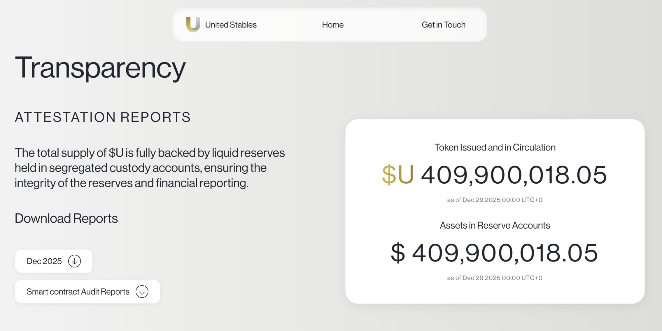 United Stables (U) is issued by United Stables Limited, a company registered in the British Virgin Islands (BVI). According to the project's official website, U is pegged to the US dollar and adopts a 1:1 reserve backing mechanism. Reserve assets are custodied through an independent trust structure to achieve legal isolation from the issuer's assets. Fiat reserves are held in compliant banking institutions, while digital asset reserves are custodied by licensed custodians.