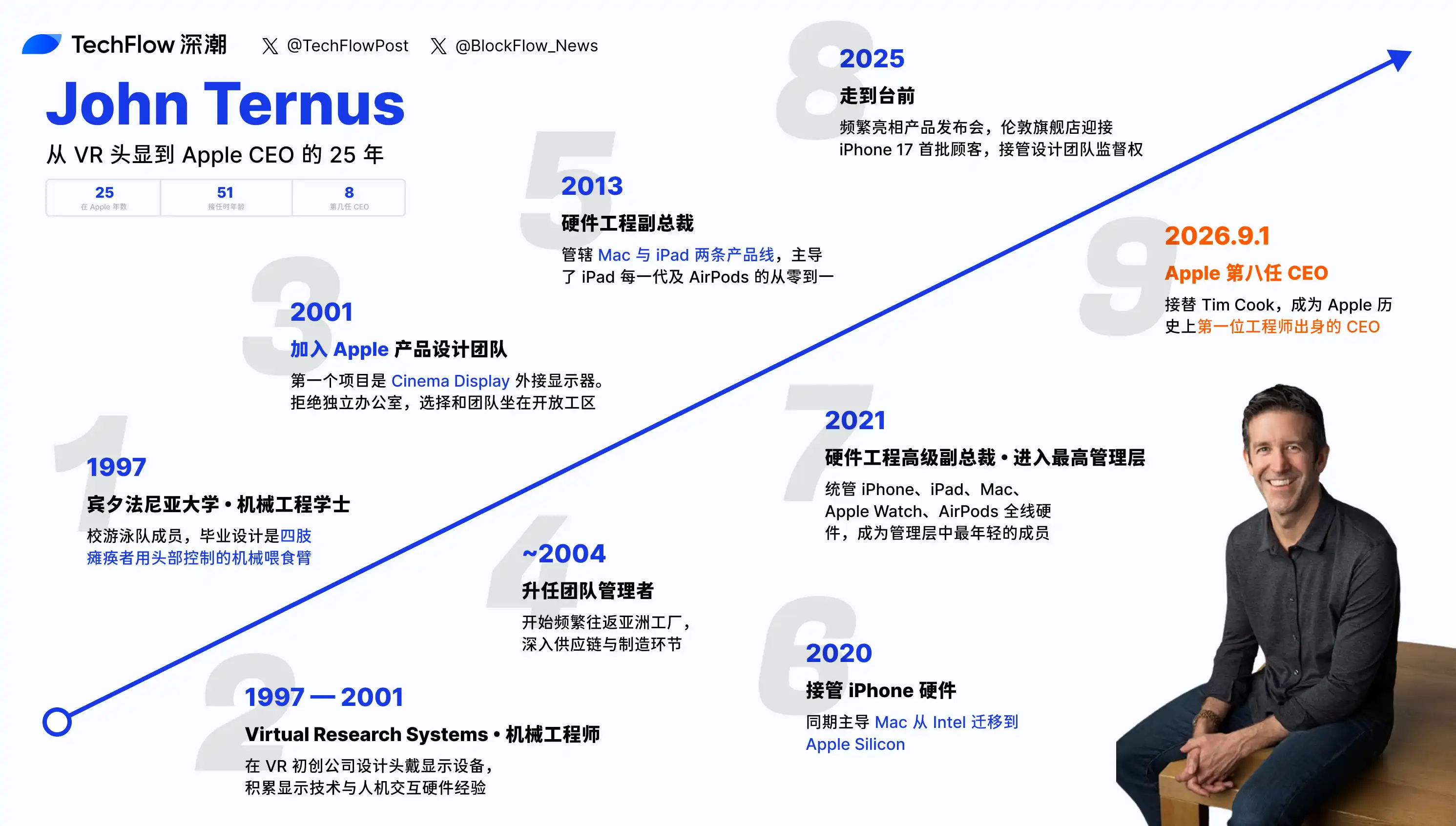 On April 20, Apple announced that Tim Cook will step down as CEO on September 1 and transition to the role of Executive Chairman. His successor, John Ternus, is 51 years old, has been with Apple for 25 years, and previously held the title of Senior Vice President of Hardware Engineering.