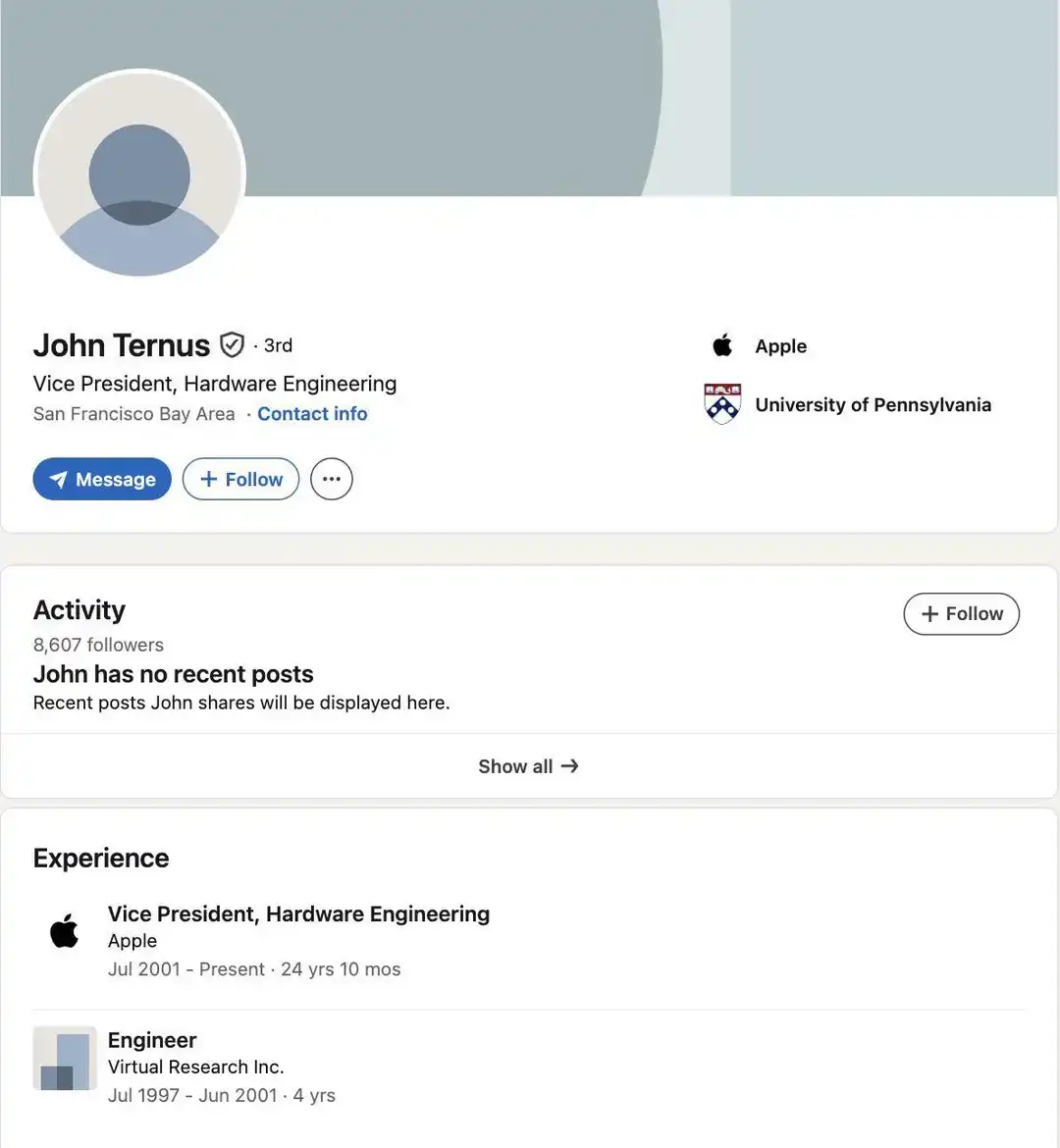 A check of his LinkedIn reveals that Ternus is incredibly low-profile—he doesn't even have a profile picture or any posts. Perhaps until today, he hasn't cared much about maintaining a public image, focusing more on working with hardware.