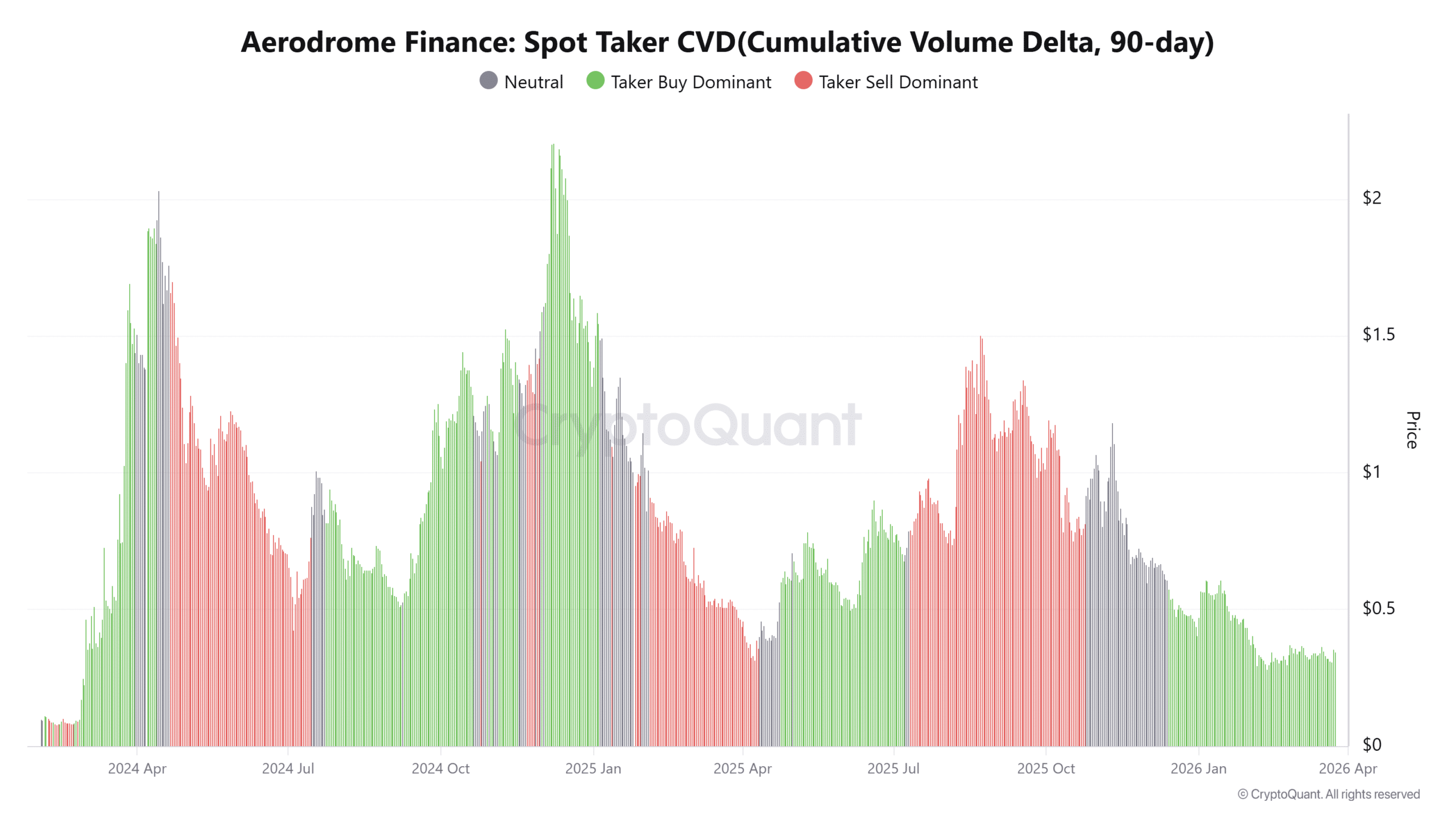 现货吃单者CVD(Spot Taker CVD)在发稿时仍由买家主导,表明激进的市场订单继续偏向买入活动而非卖出压力。