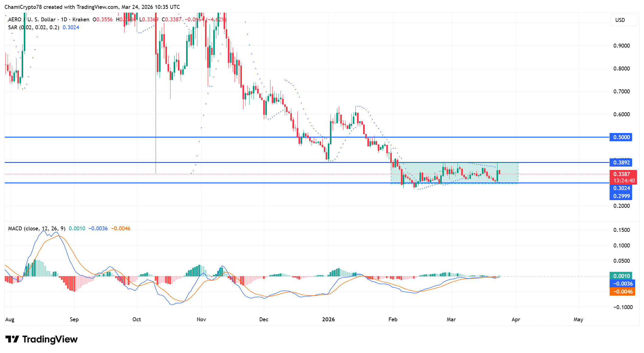 AERO价格继续稳定在0.302美元支撑区域上方,该区域在近期的回调中一直坚挺。该水平与0.299美元附近的下边界紧密对齐,买家曾多次在此处抵御下行尝试。然而,价格仍被压制在0.389美元的阻力位下方,形成了一个紧密的盘整区间。