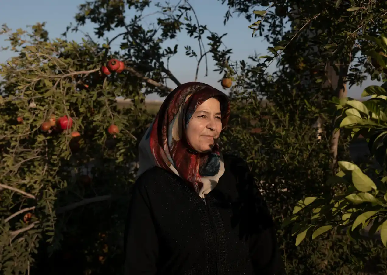 Hala Mahmoud Almahmoud outside her home near Latamina, Syria. She received $500 in cryptocurrency aid to help reopen her farm.