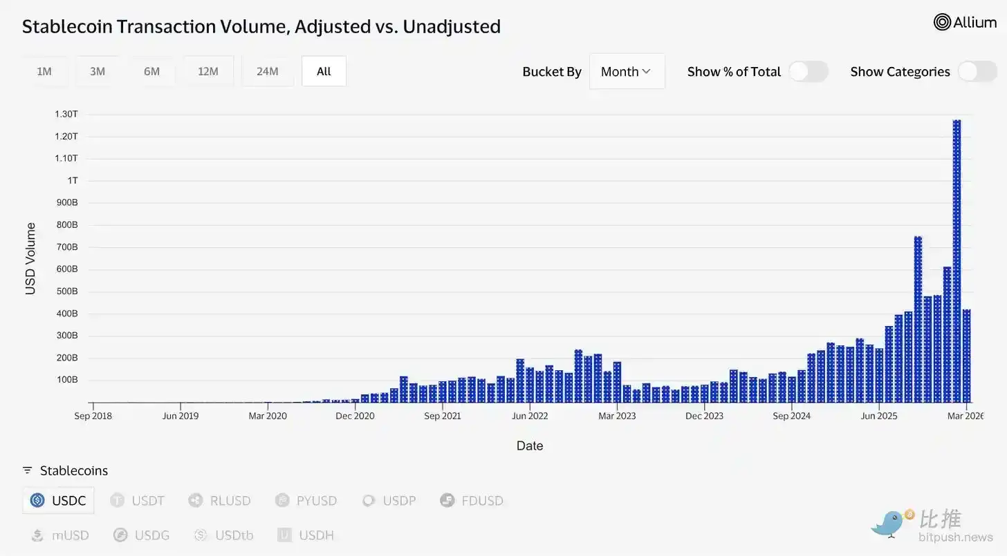 AIn February, USDC processed approximately $1.26 trillion in adjusted transaction volume, significantly higher than USDT's $514 billion, despite USDT having a much larger market cap ($184B vs. $79B). This indicates that USDC is used more frequently for active settlement and value transfer, especially in regions with banking instability, rather than just being held ('sleeping supply').