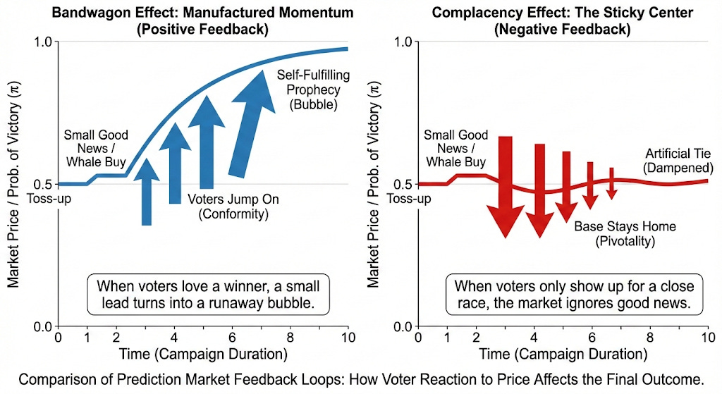 从众效应指的是选民倾向于支持看似会获胜的候选人,无论是出于从众心理、支持获胜者的满足感,还是认为市场赔率反映了候选人的素质。