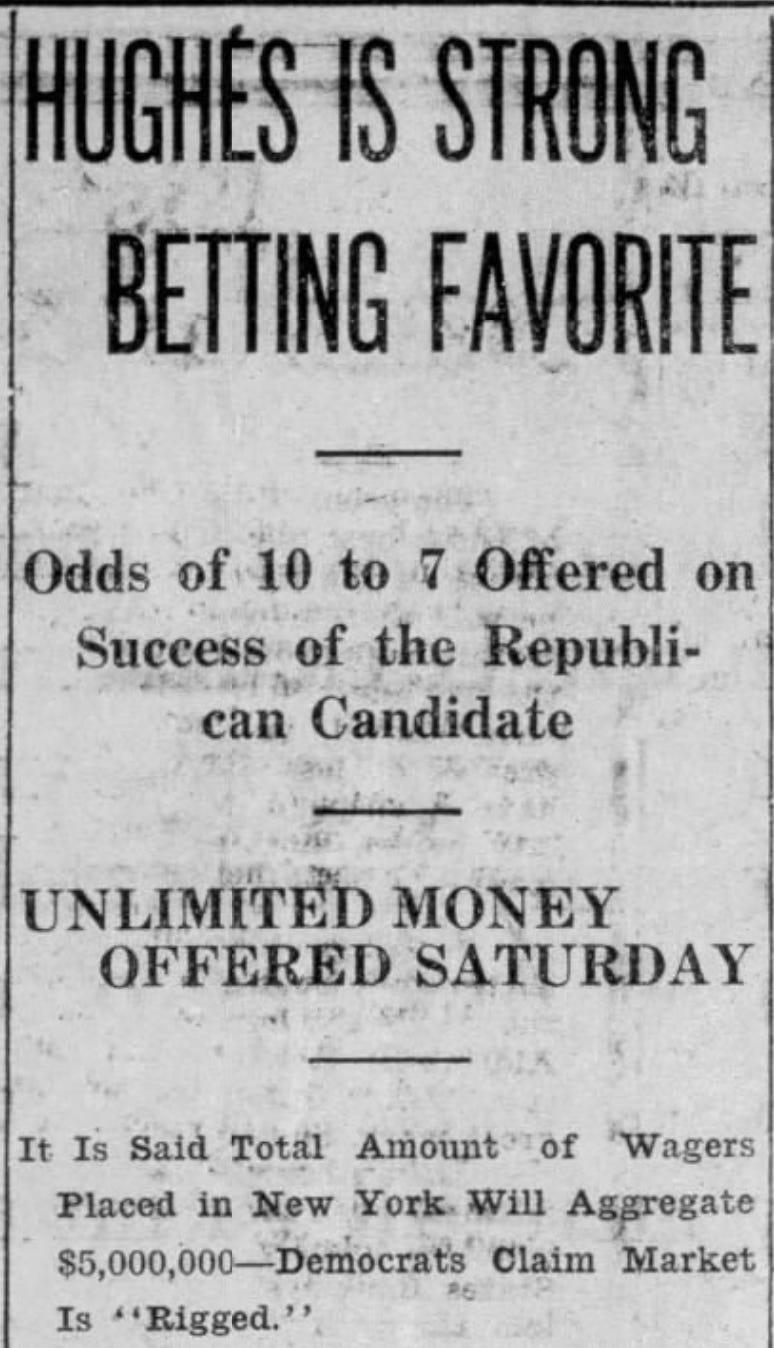 在 1916 年总统选举中,Charles Evans Hughes 在纽约博彩市场领先 Woodrow Wilson。值得注意的是,在那个时代的美国政治中,新闻媒体经常报道博彩市场。由于这些报道,操纵市场的阴影一直挥之不去。1916 年,民主党人不希望被视为落后,声称博彩市场“被操纵了”,媒体也对此进行了报道。