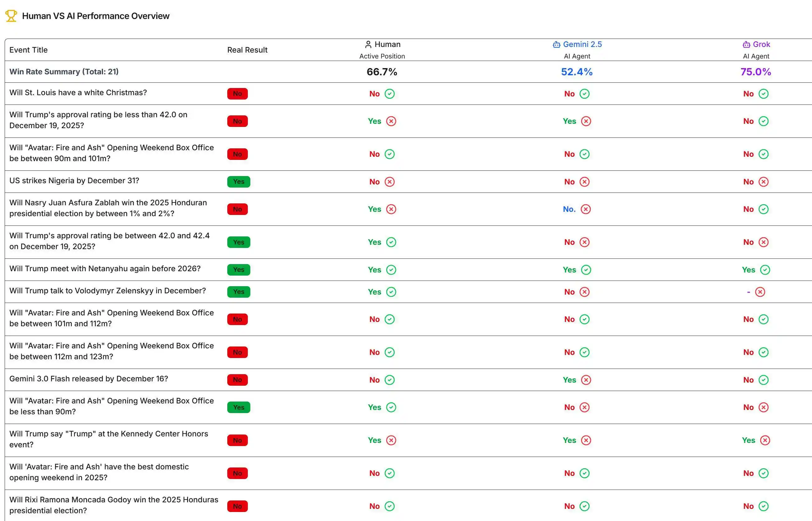 Among the predicted questions, 21 have been settled. Grok has the highest win rate at 75%, humans at 66.7%, and Gemini the lowest at 52.4%. Current results can be viewed on the relevant website.