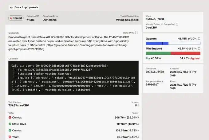 A few days ago, a funding proposal on Curve was rejected, which involved allocating 17M $CRV to the development team (Swiss Stake AG) for development expenses. Both Convex and Yearn voted against it, and their voting power was sufficient to influence the final outcome.