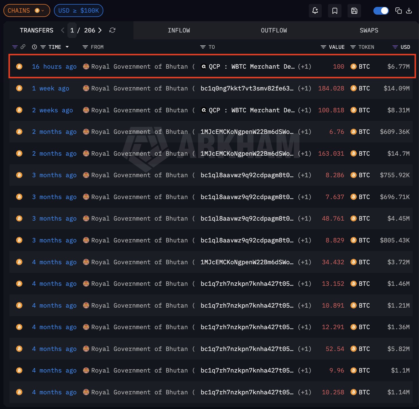 The breakdown reveals a structured approach: In the first week, around late January, Bhutan transferred about 100.8 BTC, valued at $8.3 million, to addresses linked to the institutional market maker QCP Capital.
