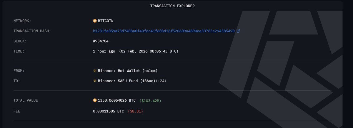 Against this backdrop, new data from Arkham has added an unexpected twist. Arkham reports that Binance’s SAFU fund has begun accumulating Bitcoin, purchasing 1,315 BTC—worth roughly $100 million—within the last hour. This move contrasts sharply with prevailing risk-off sentiment and suggests that, even as prices trend lower, Binance may be positioning defensively or opportunistically amid market stress.