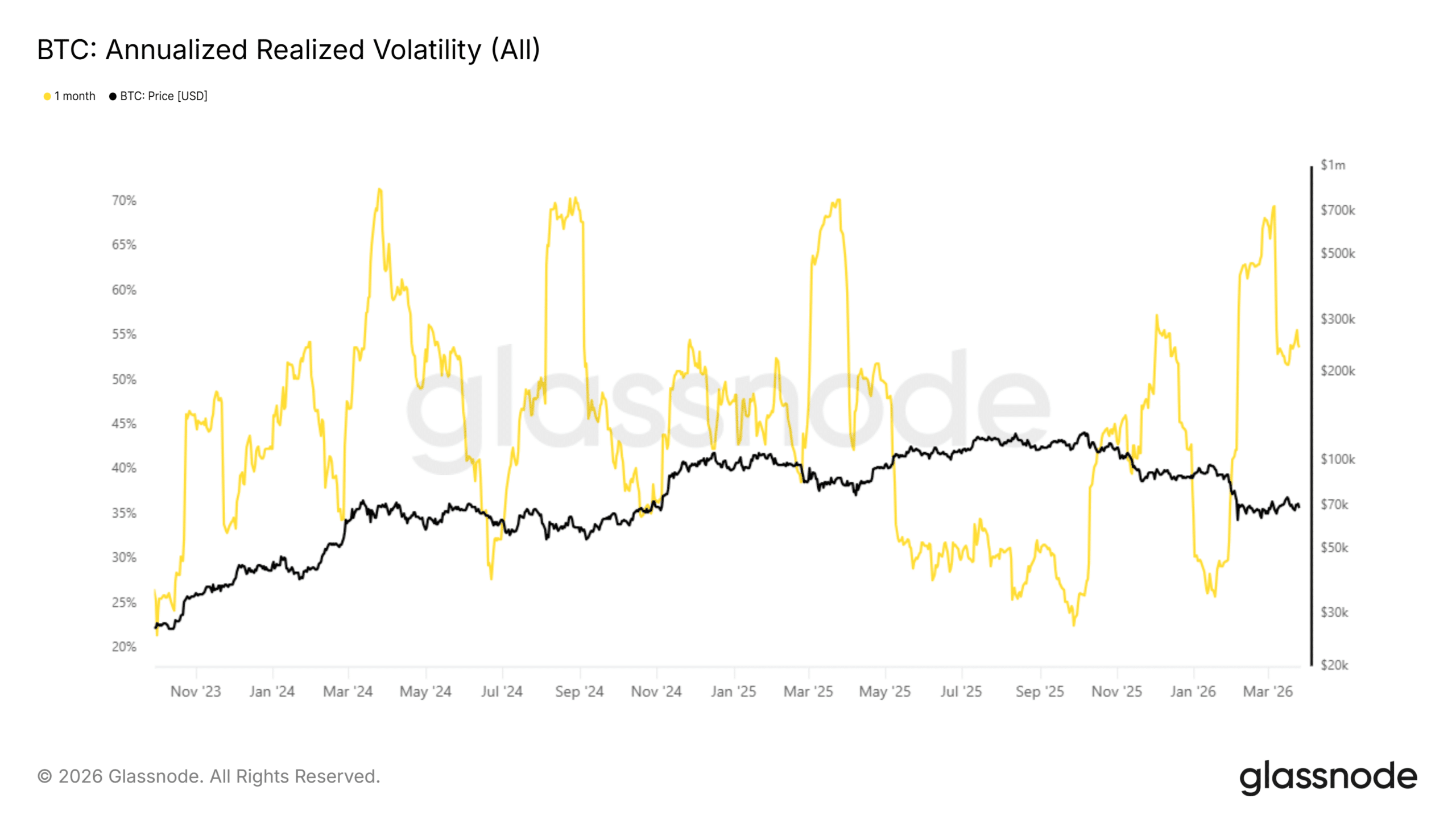 On the back of this range remaining consistent, volatility has declined too, with the 30-day realized volatility of 54% alluding to a fall in activity. In previous market cycles, such calm periods have often followed strong moves, where both buyers and sellers paused, allowing the market to reset.