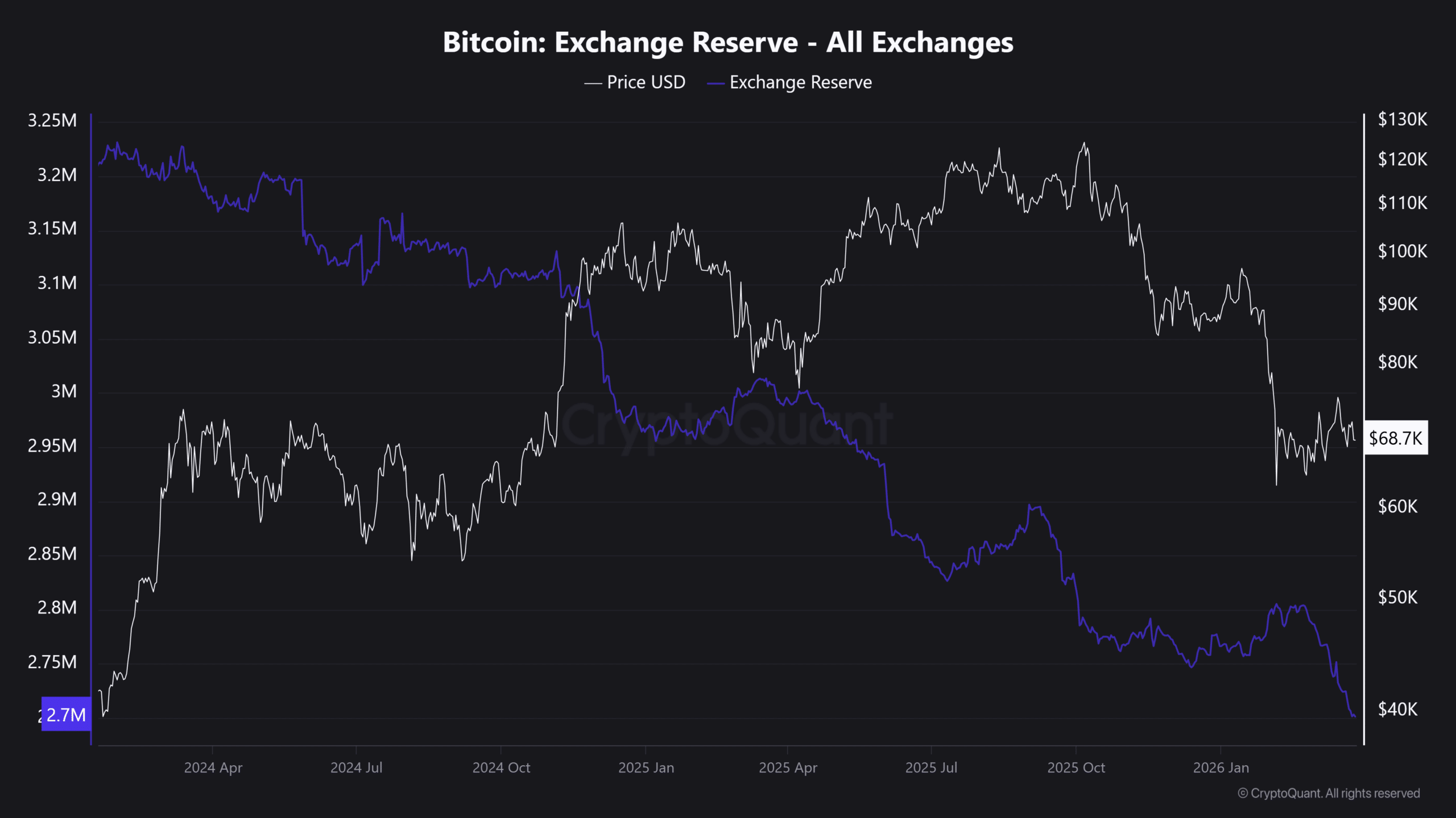 However, despite the price later pulling back near $68,700, reserves kept falling, which signaled that selling pressure remained limited. This pattern revealed that holders might prefer storage over distribution, despite the weaker price action. Meanwhile, brief reserve upticks have failed to reverse the broader downtrend, reinforcing sustained accumulation.