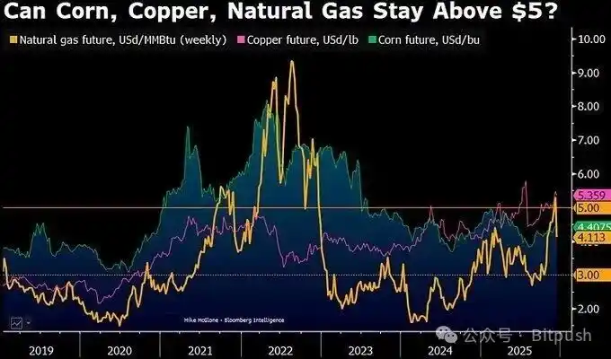 He points out that by around 2026, commodity prices may fluctuate around a key pivot—the "inflation-deflation demarcation line" for core commodities like natural gas, corn, and copper could settle near $5. Among these, only copper, with its real industrial demand support, might still be above this pivot by the end of 2025.